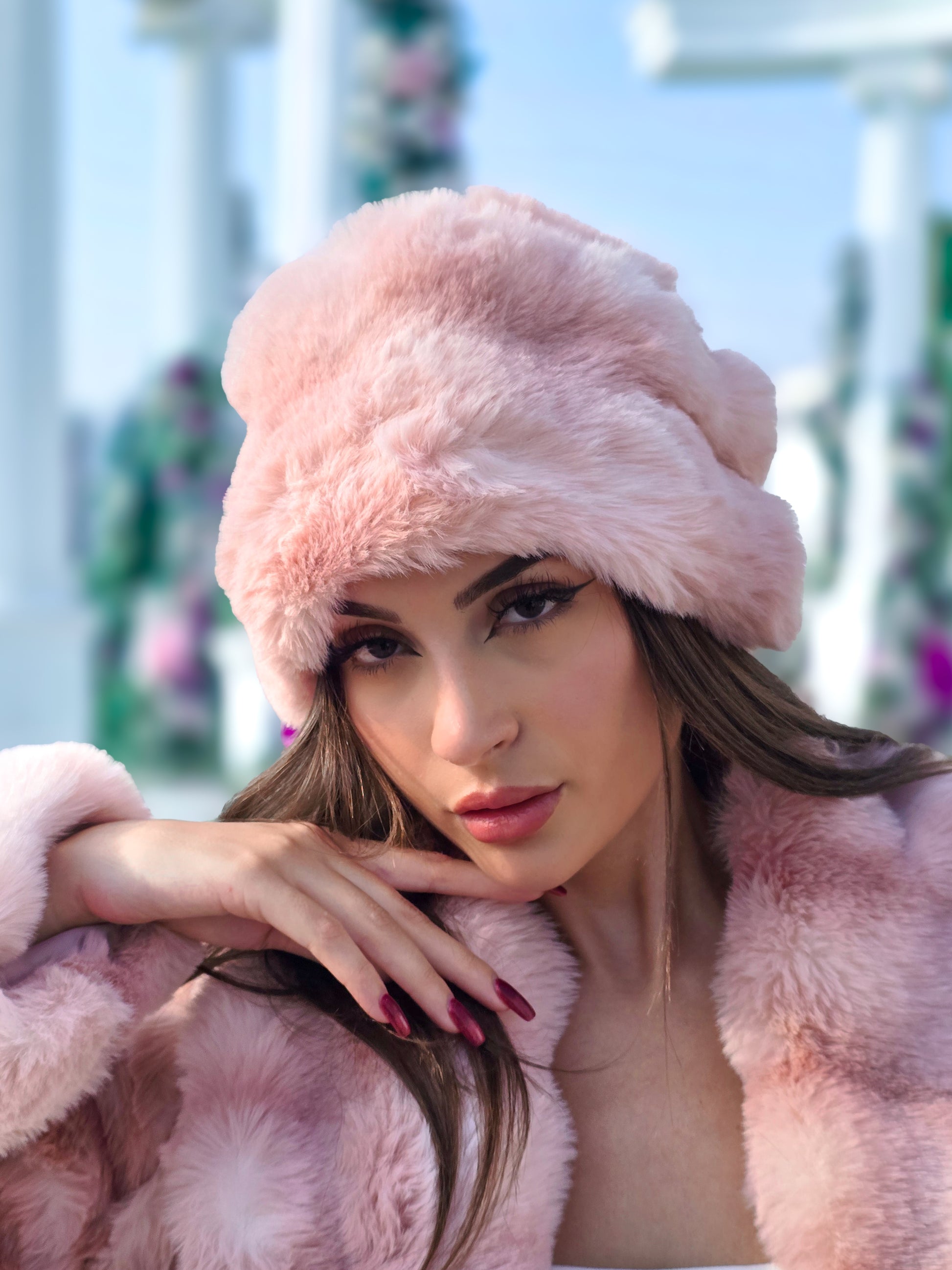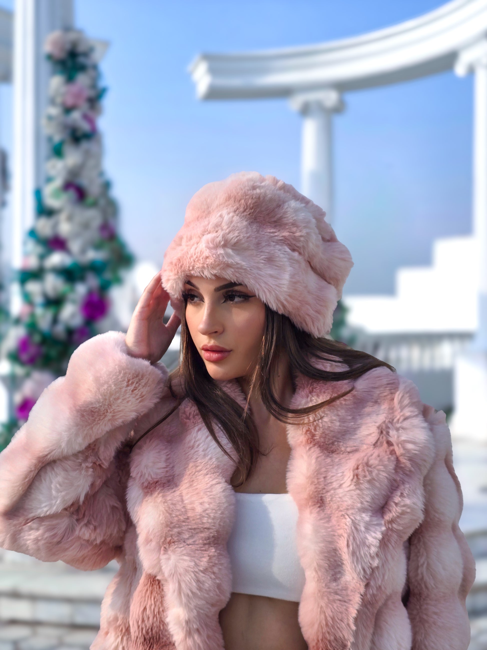 A luxurious winter hat in delicate rose tones, crafted from soft rabbit fur for a cozy and elegant touch. Perfect as a standalone statement piece for a polished, warm winter look.